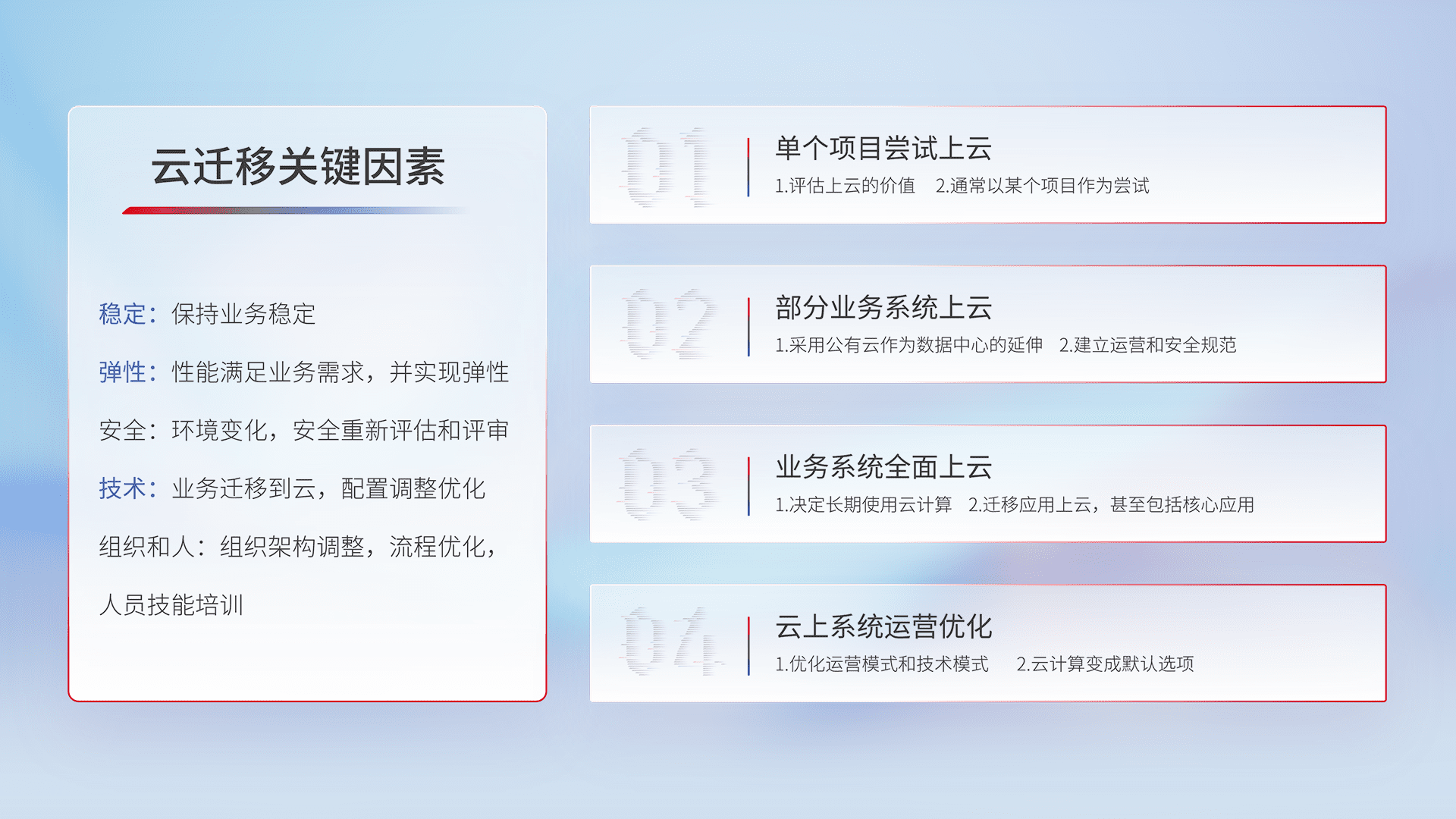 结合实际业务,,,,从规划设计、、、云平台选型、、、、云原生改造、、数据迁移、、、、集成交付,,迁移全过程为客户识别最佳上云路径,,,做好风险识别管理,,设计网络架构、、、、身份权限、、、安全审计合规、、操作审计、、、、日志审计、、、、监控告警策略、、多站点容灾设计等,,,对云上基础设施进行整体规划,,,提升IT治理水平,,,以满足弹性、、、、高可用、、、高性能的需求。。