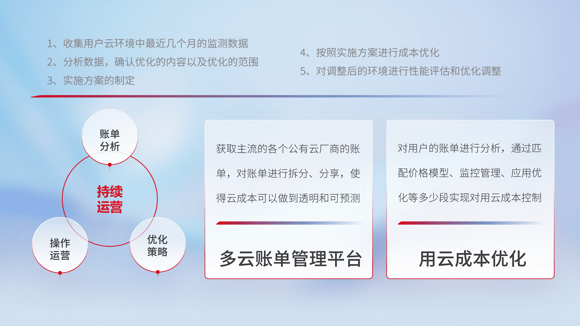 通过多云纳管,,以统一的资源数据模型把客户的云资源进行抽象和封装,,,进而实现对多云资源的统一操作,,保障云资源管理的可靠性、、、稳定性与可用性。。。。量身定制化运维内容,,配置、、、、开发运维、、、补丁管理、、、、备份、、、监控、、认证和访问管理、、审计和日常巡检等,,保障在用云过程中的可靠度,,稳定度以及高可用率。。。